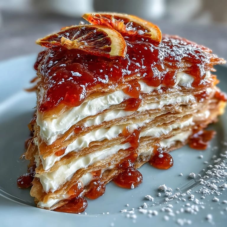 This exquisite layered dessert combines tender crêpes with a generous filling of zesty blood orange curd and light, airy whipped cream. It's a showstopper, deceptively simple to assemble, especially when utilizing quality store-bought crêpes and curd to save time. The assembly involves alternating layers of crêpes, curd, and whipped cream, then chilling for a firm set.