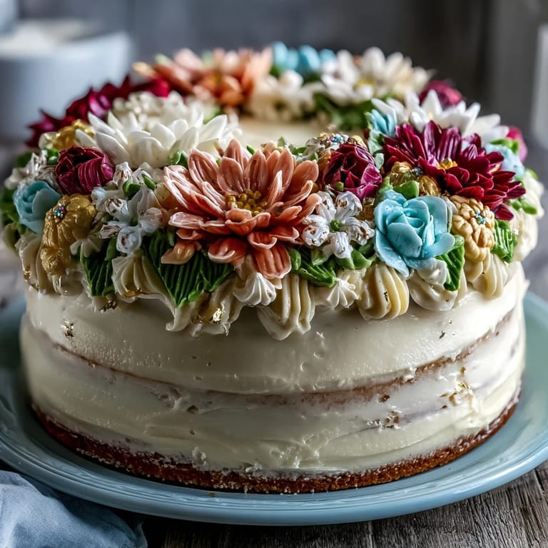 For an extra dimension of flavor, consider adding 1 tsp almond extract to the cake batter—it complements the vanilla beautifully and adds a subtle sophistication. When working with buttercream florals, you can pipe designs onto parchment paper, chill them until firm, and then carefully transfer them to the cake for more intricate and controlled placement. This technique is especially helpful for beginners or when creating elaborate floral arrangements. Make sure all your cake layers are completely cool before frosting to prevent melting and sliding. Using a cake turntable makes the frosting process smoother and more professional-looking.